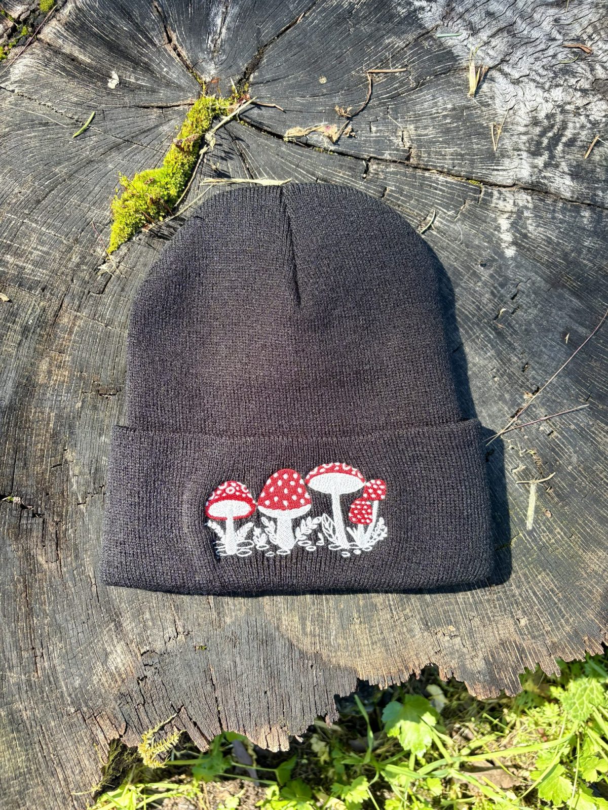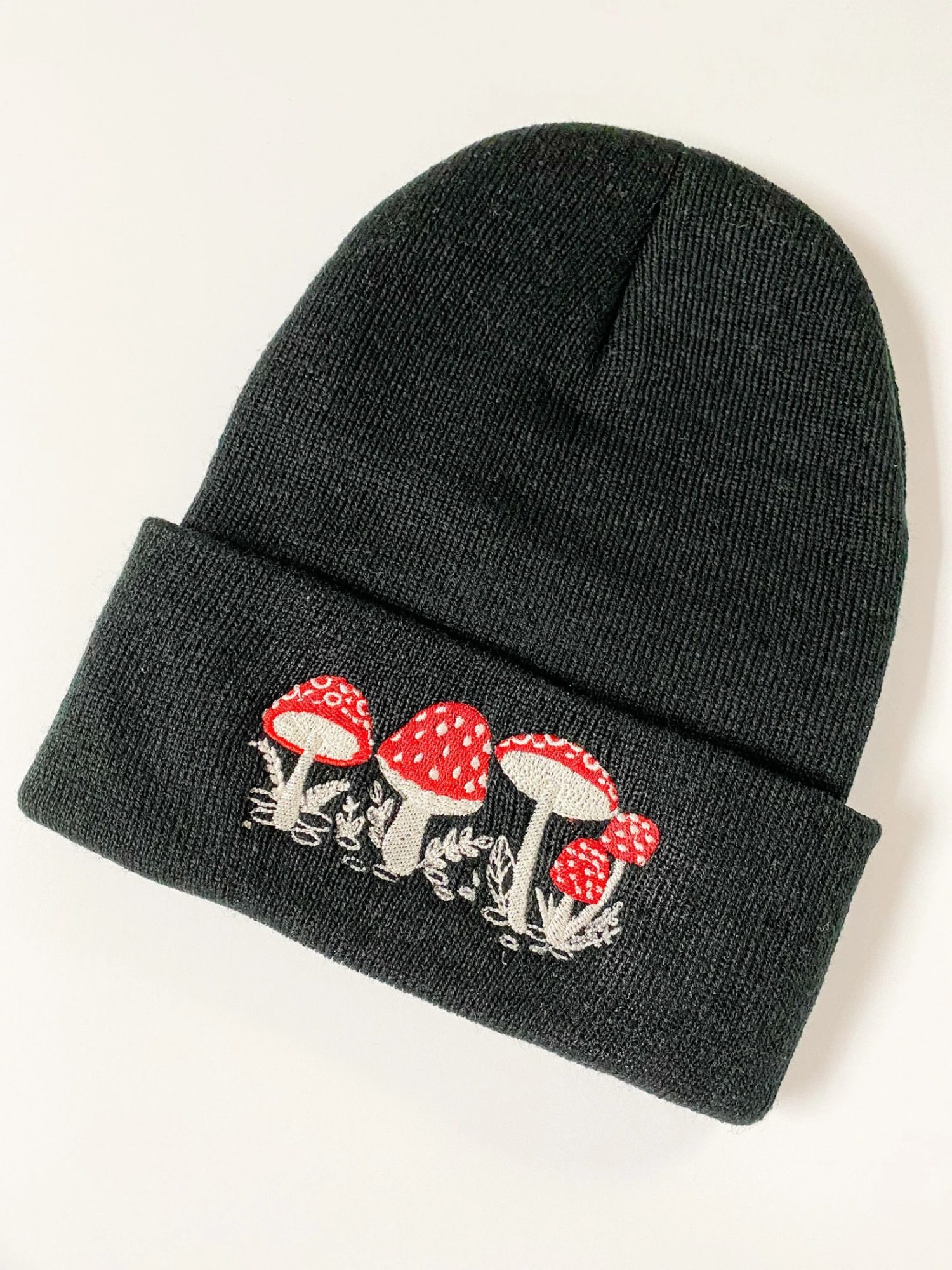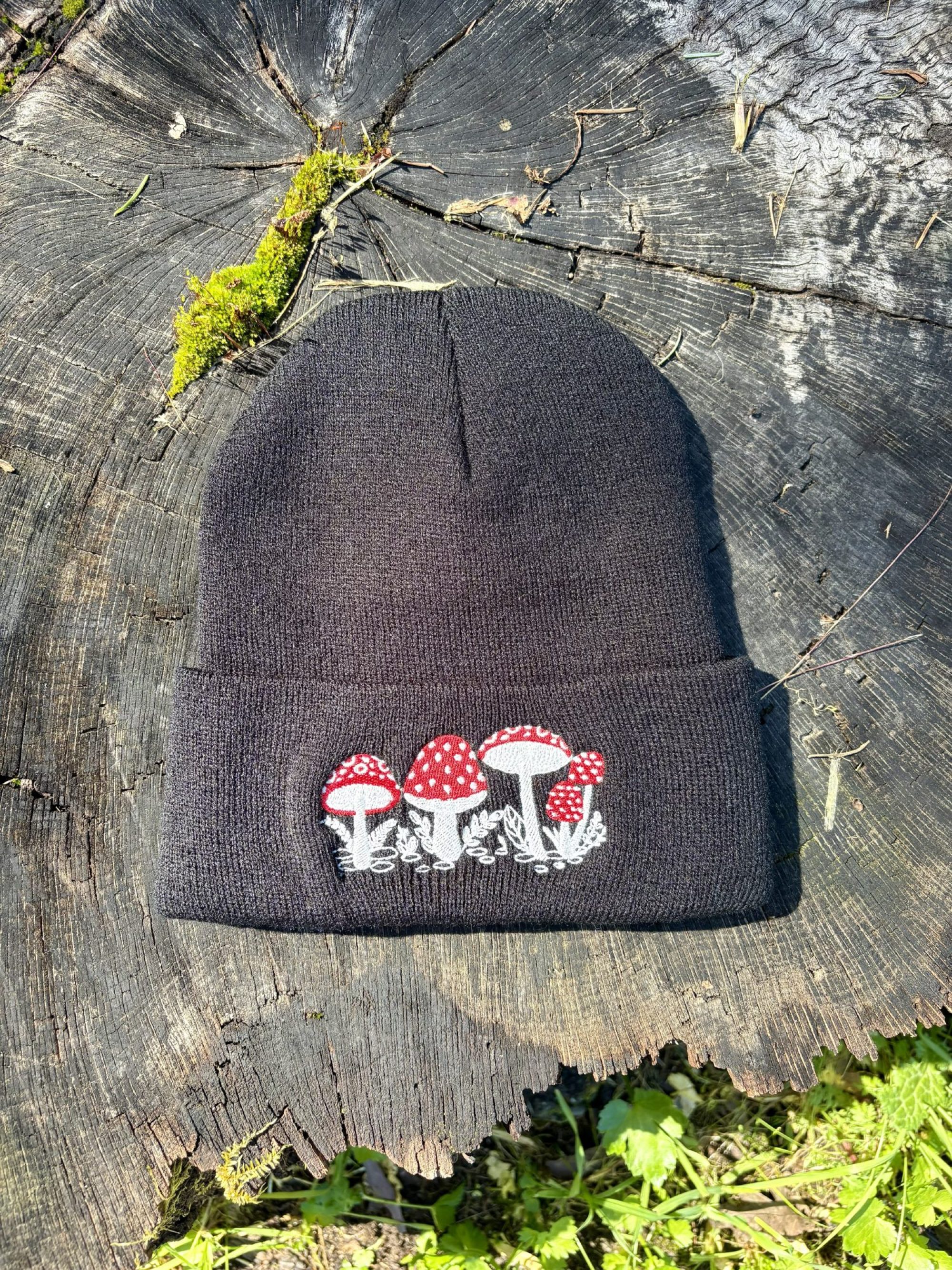 🍄 Do you find yourself wandering down forest paths, searching for mushroom caps poking inconspicuously out of the leaf litter? Are you a curious forest dweller, hunting for life amongst the towering trees? You may just love the newest addition to our mushroom-themed apparel. Feel inspired by the bright red and white Amanita muscarias gracing the black background. This beanie is sure to keep you warm and stylish on all of your adventures 🍄