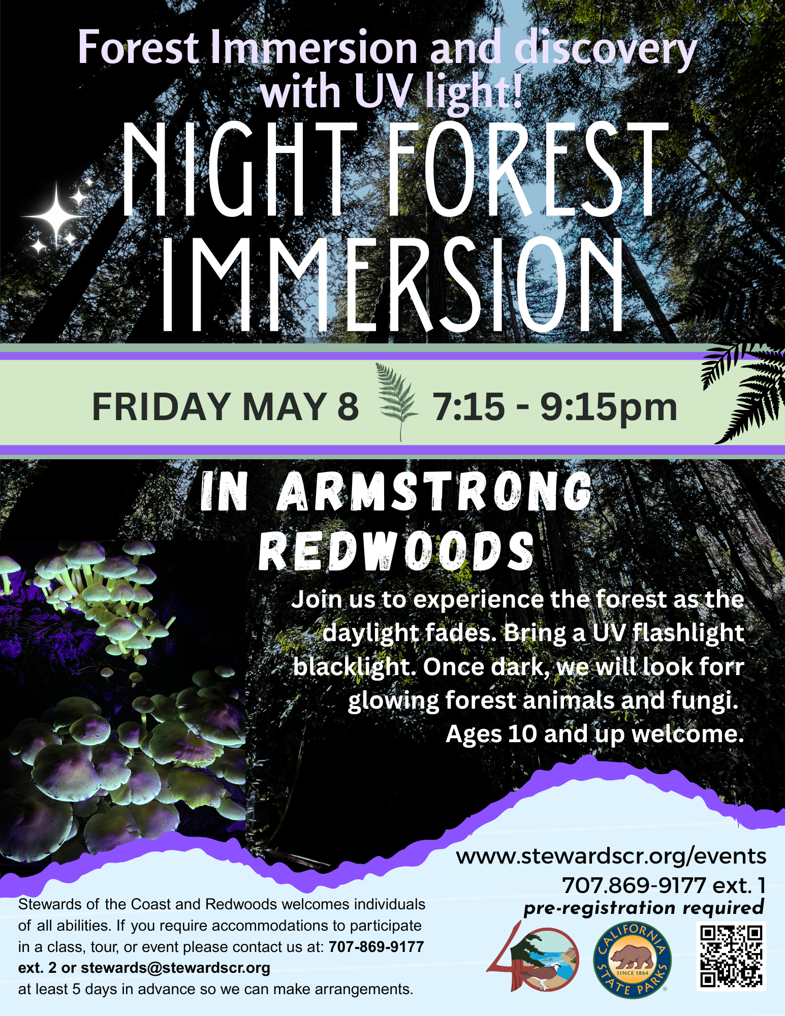 Meet us at Armstrong Redwoods for an evening walk on May 8 at 7:15 pm. Dress in warm layers, and bring a UV light. We will learn to relax and connect with nature in the beautiful redwood forest, walking slowly and quietly around the forest floor trails, stopping frequently to see, listen, touch, smell, and taste. As the evening gets darker, we will use our UV lights to look for glowing millipedes, scorpions and various fungi. Rain will cancel, and we will try to reschedule.