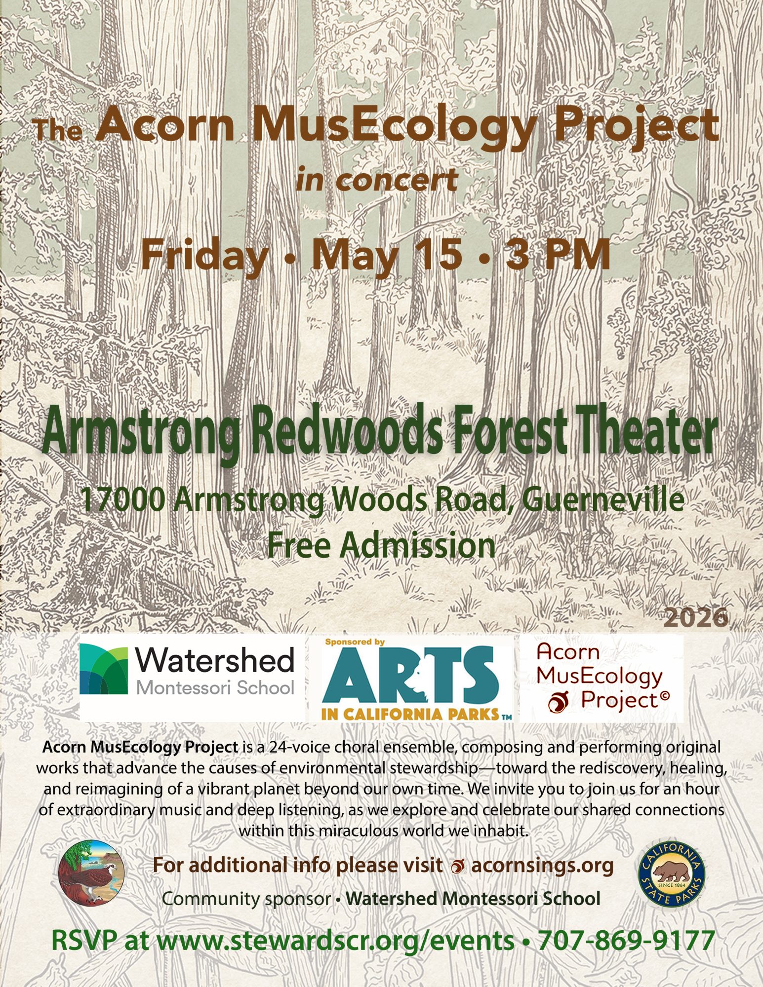 Join us for The Acorn MusEcology Project on Friday, May 15, 2026 starting at 3PM at the Armstrong Redwoods Forest Theater. Acorn MusEcology Project is a 24-voice choral ensemble, composing and performing original works that advance the causes of environmental stewardship – toward the rediscovery, healing, and reimagining of a vibrant planet beyond our own time.