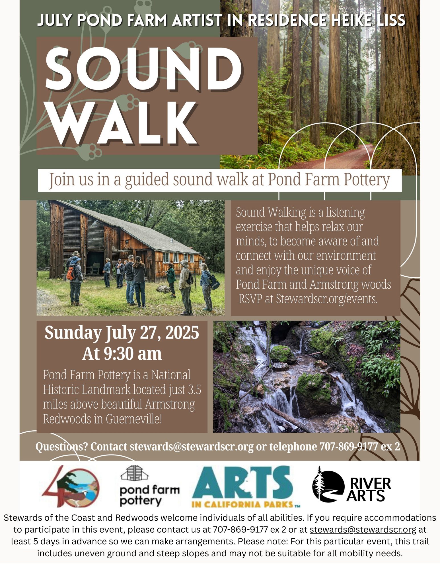 Heike Liss, Artist in Residence at Pond Farm for July, will lead a guided Sound Walk at and around Pond Farm. Sound Walking is a listening exercise that helps relax our minds and become aware of and connect with our environment. We will spend an hour walking together in silence to listen to the unique voice of Pond Farm and Armstrong woods. Please wear comfortable clothes and shoes, a snack or lunch (if you want to eat in the park later) something to drink/a water bottle.